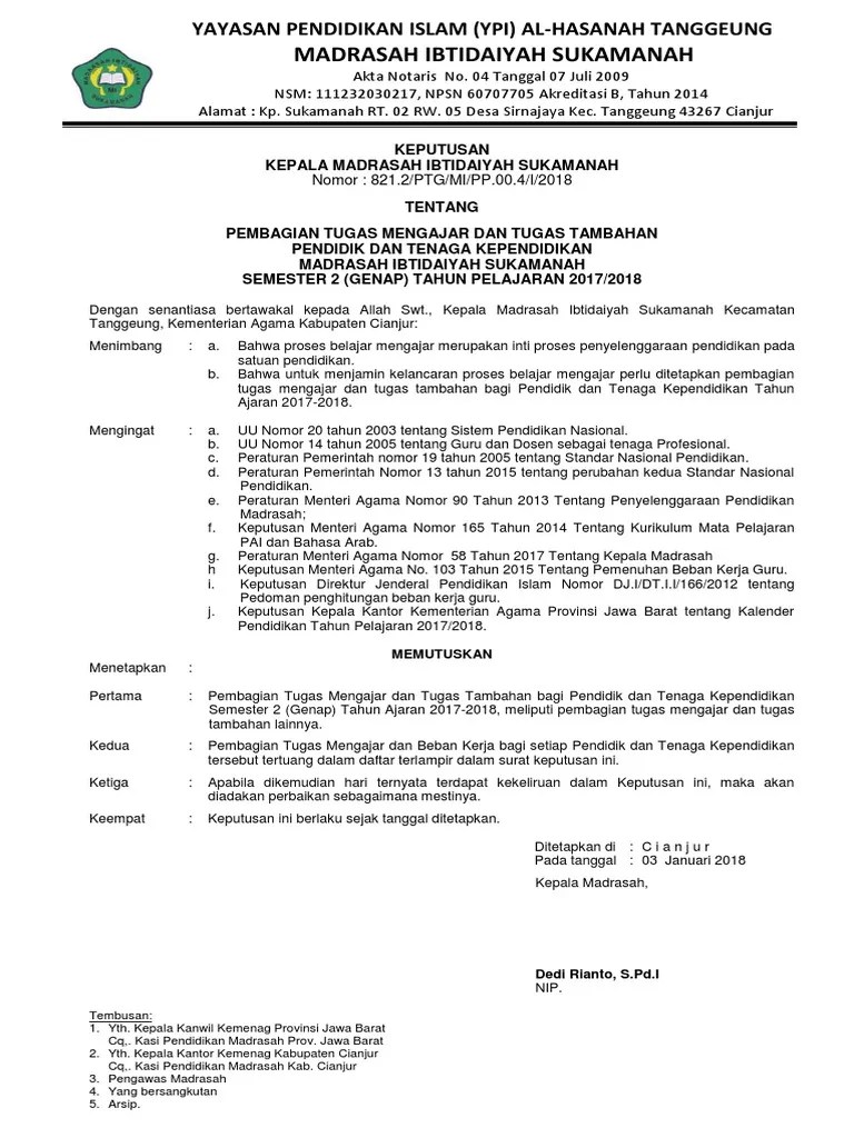 pembagian tugas guru dalam kegiatan belajar, bimbingan, dan ekstrakulikuler mi tarbiyatusy syubban kalimulyotahun pelajaran. Bapak ibu bisa mendownload contoh sk yang lain di bawah ini : sk pembagian tugas mengajar tahun 2020 2021 websiteedukasi com. contoh sk beban kerja guru doc unduh. Download contoh sk pembagian tugas mengajar guru dta atau madrasah diniyah takmiliyah dalam format doc ms word bisa diedit lengkap dengan undang undang serta aturan dan ketentuan dalam pma sebagai landasan pengeluaran surat tugas pembagian tugas mengajar ustadz ustadzah pada madin. sk pembagian tugas mengajar pada semester ii tahun pelajaran 2020/2021 dapat dilihat disini. sk pembagian tugas guru sd. contoh format surat tugas mengajar berikut contoh sk pembagian tugas mengajar bagi guru dengan format terbaru untuk tahun pelajaran 2016 2017 untuk semester 1 maupun semester 2 nantinya dan dalam format ini tetap ada penambahan jumlah pada masing masing rombel yang. contoh sk pembagian tugas mengajar smp doc cara mengajarku. 20 tahun 2003 tentang sistem. sk pembagian tugas semester ii sk pembagian tugas mengajar yang sudah ditandatangani dan distempel dibagikan kepada semua guru yang memperoleh jumlah jam mengajar dan disimpan sebagai arsip untuk administrasi sekolah. Selain itu pada postingan ini pun anda akan sangat mudah untuk memiliki dan mendapat file sk pembagian tugas mengajar guru sebab semua. The collection that comprising chosen picture and the best among others.